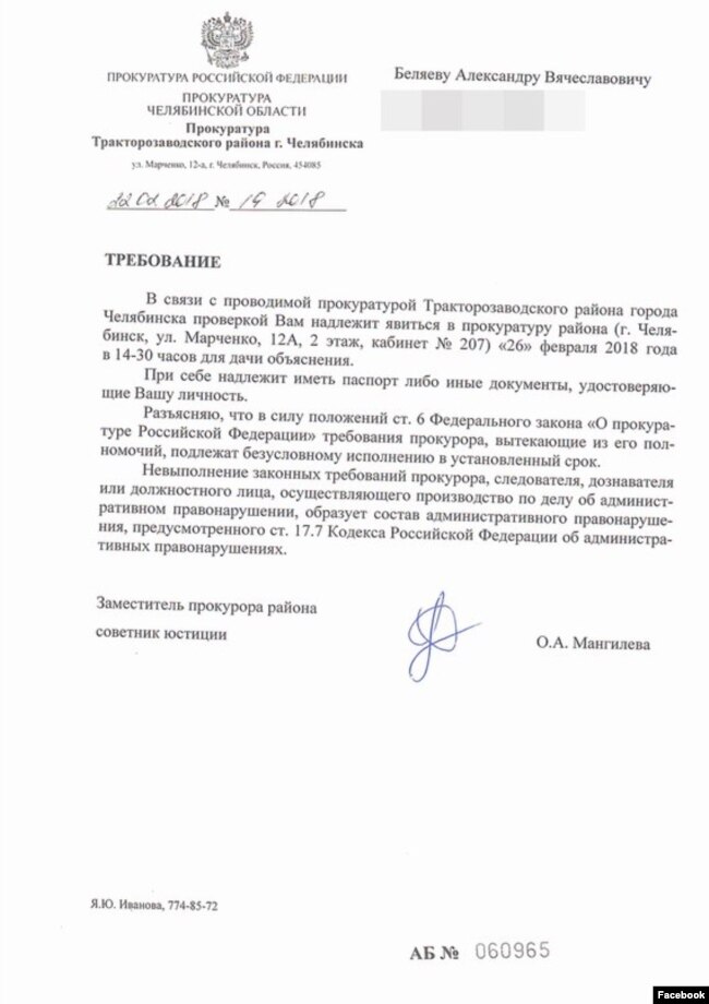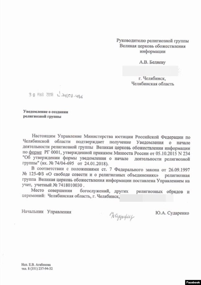 В конце января студенты подали уведомление о начале деятельности новой религиозной группы в Министерство юстиции по Челябинской области. В четверг прокуратура Тракторозаводского района Челябинска потребовала, чтобы Беляев явился для дачи показаний. Прокуратура подозревает, что представители «Великой церкви обожествления информации» занимаются миссионерской деятельностью и нарушают статью 5.26 КоАП РФ.